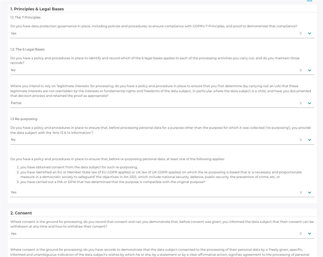 Any GDPR journey needs good gap analysis to drive remediation. Keepabl’s BenchMark tests your compliance against the GDPR and the UK e-Privacy Regulations (UK PECR) at a strategic level. Keepabl gives you an overall score – perfect for reporting to the board – and sub-scores in 16 areas to easily target your next remediation action.